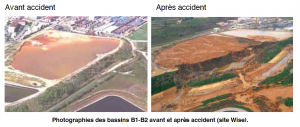 Le 20 mars 2004, la rupture sur 180 mètres d’une digue des deux plus anciens bassins B1 et B2 relâche environ 30 000 m3 de résidus radioactifs sur près de 12 hectares. Des boues sont déversées jusque au pied de l’oppidum de Montlaurès, devant le jardin d’une famille narbonnaise qui envoie des échantillons pour analyse à la CRIIRAD. Ce laboratoire indépendant y découvre non seulement de l’uranium et du radium mais aussi des radio-isotopes artificiels transuraniens (américium, plutonium-241, …), raison pour laquelle ces deux bassins seront classés Installation Nucléaire de Base (INB) en 2015.